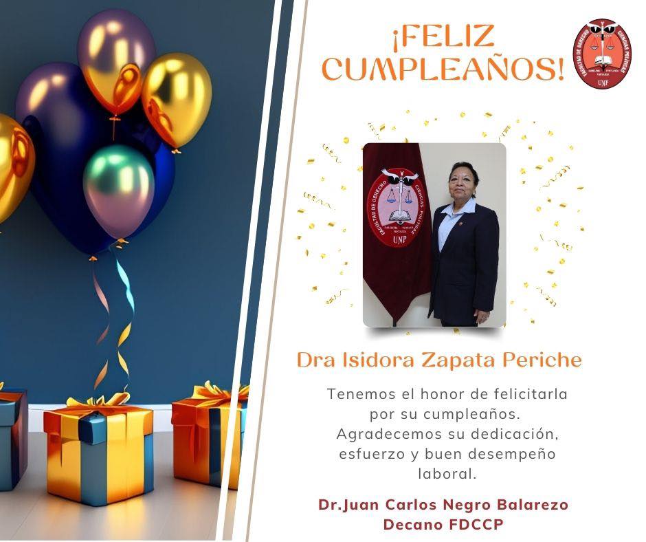 Feliz Cumpleaños Dra Isidora Zapata Periche La Facultad de Derecho y Ciencias Políticas de la Universidad Nacional de Piura expresa su más cordial y afectuoso saludo a la Dra. Isidora Zapata con motivo de su cumpleaños. El Decano, Dr. Juan Carlos Negro Balarezo, junto a la plana docente y administrativos de nuestra Facultad, le hacen llegar sus mejores deseos de salud, bienestar y prosperidad. Apreciamos profundamente su dedicación, compromiso académico y valiosa contribución a la formación jurídica de nuestros estudiantes. ¡Feliz cumpleaños, doctora!Que este nuevo año de vida esté lleno de éxitos, alegrías y satisfacción personal y profesional. 08/12 DICIEMBRE