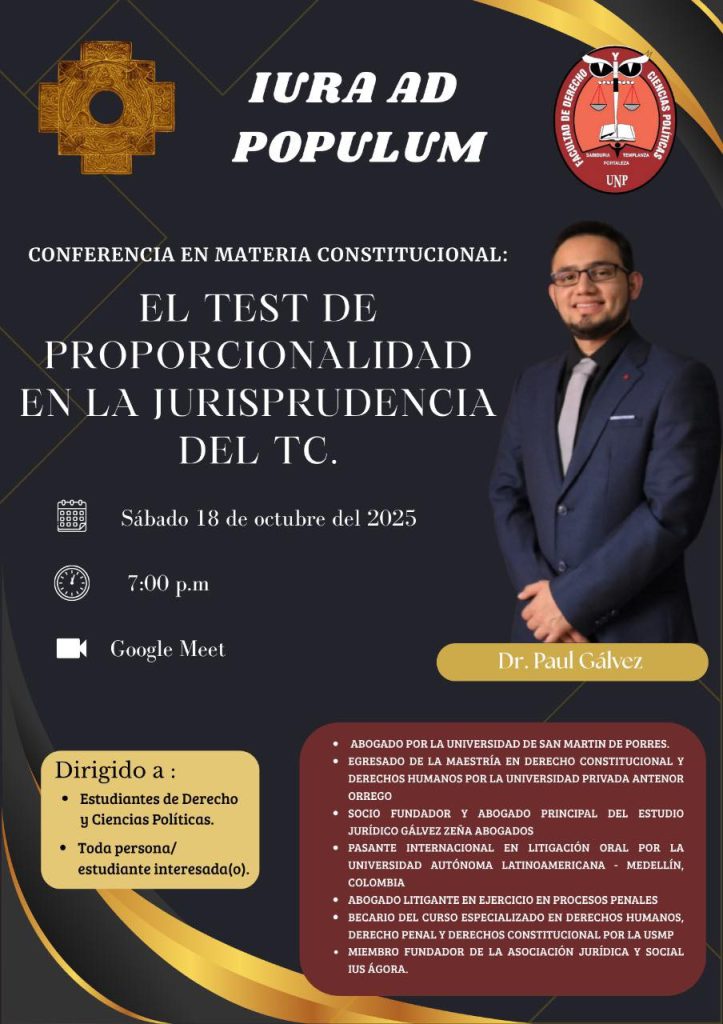 NOTICIAS Lo más reciente Conferencia: “Todo sobre la vacancia de Dina Boluarte y el Gobierno Transitorio de José Jerí Oré” octubre 16, 2025 Conferencia en materia civil: “Prescripción Adquisitiva” octubre 16, 2025 DÍA MUNDIAL DE LA SALUD MENTAL octubre 10, 2025 Convocatoria al Programa de Extensión Universitaria SUNASS 2026 octubre 9, 2025 Nuestra estudiante representará a la UNP en el Concurso Nacional e Internacional de Oratoria Cusco 2025 octubre 9, 2025 PUBLICACIÓN DE “ECOS DE ATARAXIA” – 4 AÑOS DE LITERATURA octubre 9, 2025 16 de octubre 2025 Conferencia: “La Transformación del Poder y el Inicio Constitucional” La Facultad de Derecho y Ciencias Políticas de la Universidad Nacional de Piura invita a participar en la conferencia:“La Transformación del Poder y el Inicio Constitucional”, a cargo del Mgtr. Víctor Paima. -Miércoles 22 de octubre del 2025– 6:00 p.m.-Auditorio Fernando Gallo Zapata (FDCCP – UNP) El ponente es politólogo de profesión (UNMSM), con posgrado en Sistema de las Organizaciones (Bordeaux, Francia) y docente de la Universidad Nacional Mayor de San Marcos.