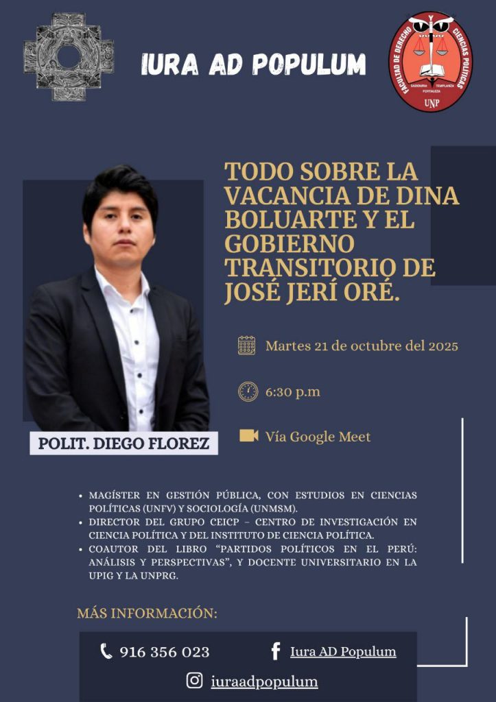 NOTICIAS Lo más reciente Conferencia en materia civil: “Prescripción Adquisitiva” octubre 16, 2025 DÍA MUNDIAL DE LA SALUD MENTAL octubre 10, 2025 Convocatoria al Programa de Extensión Universitaria SUNASS 2026 octubre 9, 2025 Nuestra estudiante representará a la UNP en el Concurso Nacional e Internacional de Oratoria Cusco 2025 octubre 9, 2025 PUBLICACIÓN DE “ECOS DE ATARAXIA” – 4 AÑOS DE LITERATURA octubre 9, 2025 Ceremonia de Doctor Honoris Causa octubre 9, 2025 10 de octubre 2025 Conferencia: “Todo sobre la vacancia de Dina Boluarte y el Gobierno Transitorio de José Jerí Oré” La Facultad de Derecho y Ciencias Políticas de la Universidad Nacional de Piura, a través del espacio académico Iura Ad Populum, presenta la conferencia:“Todo sobre la vacancia de Dina Boluarte y el Gobierno Transitorio de José Jerí Oré”, a cargo del Polit. Diego Florez. -Martes 21 de octubre del 2025-6:30 p.m.-Vía Google MeetEl expositor es magíster en Gestión Pública, director del Grupo CEICP y docente universitario con amplia experiencia en Ciencia Política.